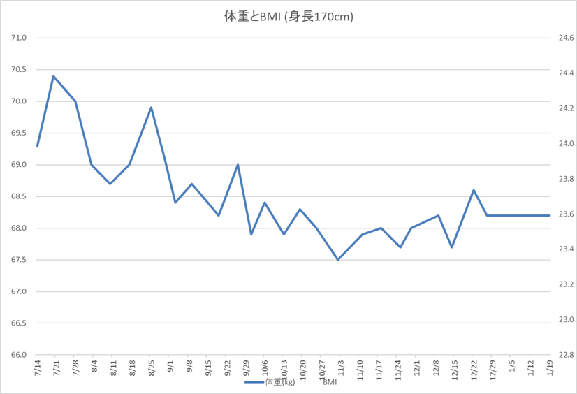 BMI記録2026年度1Q 2026.01.19 年末年始にやや運動不足と食べ過ぎでリバウンドしたかなと思ったけど、その後もかなり安定して推移している。 コロナの頃に始めた筋トレも地味に継続はしているし、お腹のすき具合などから判定しても、今の体重68kg, BMI23.5ぐらいを健康体重と判断して、これ以上下げようとしなくてもいいかもしれない。