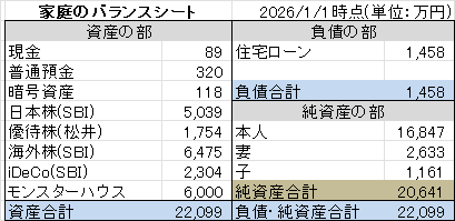 毎年正月の習慣として、家庭のバランスシートを更新。変更が多かった去年と比べて、今回はそこまで大きな違いはない。